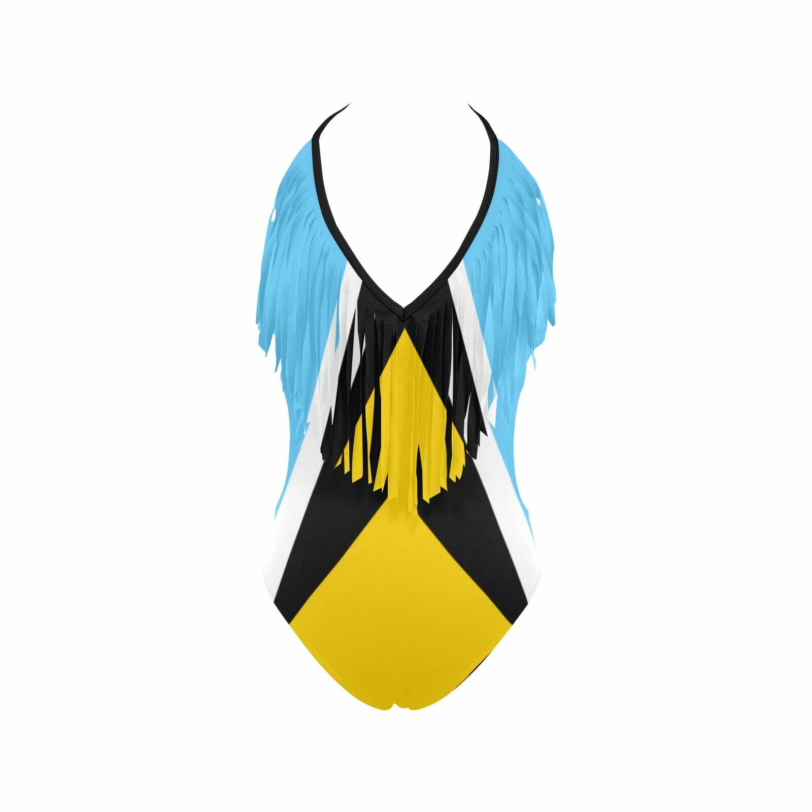 Elevate your beachside glamour with our Saint Lucia Flag Women’s Fringe One Piece Swimsuit, a stunning masterpiece of Caribbean style and comfort. This isn’t just swimwear; it’s your ticket to Caribbean allure.